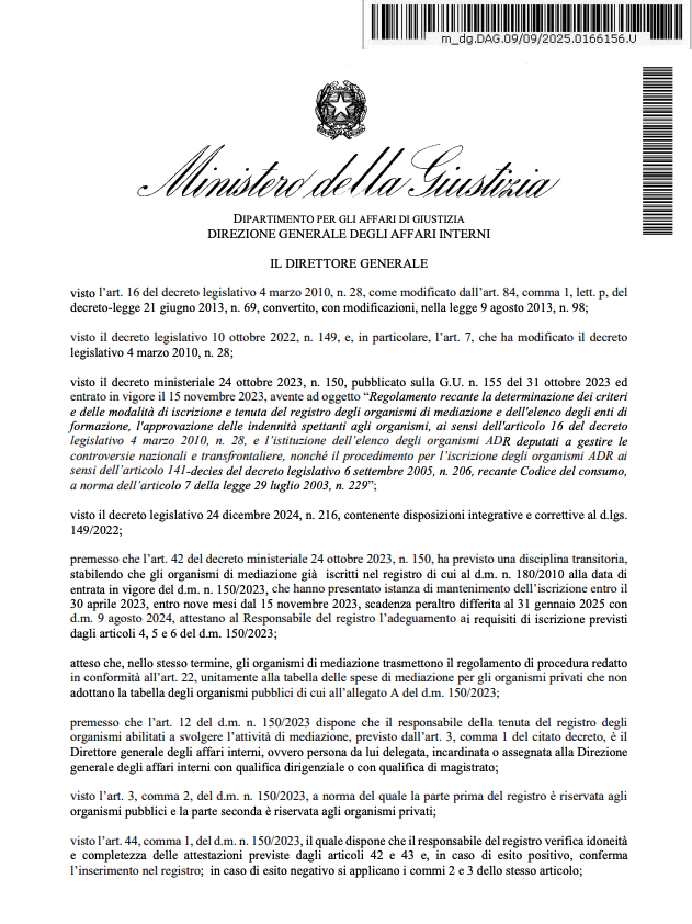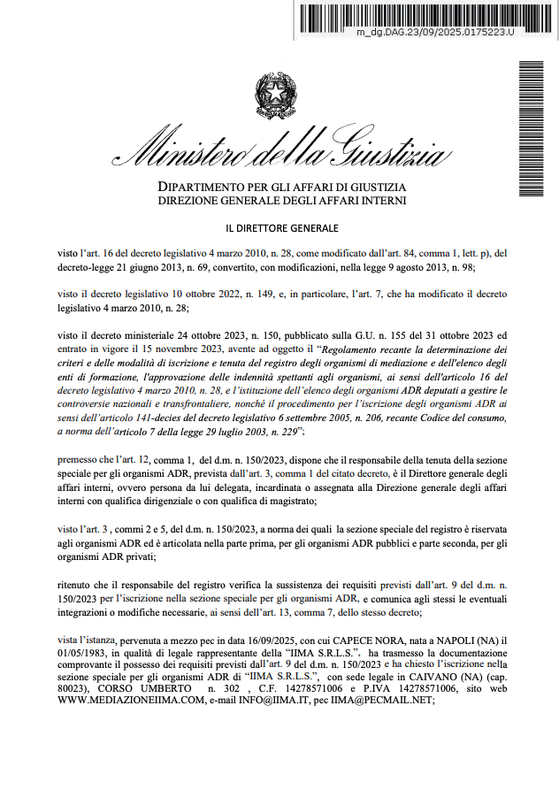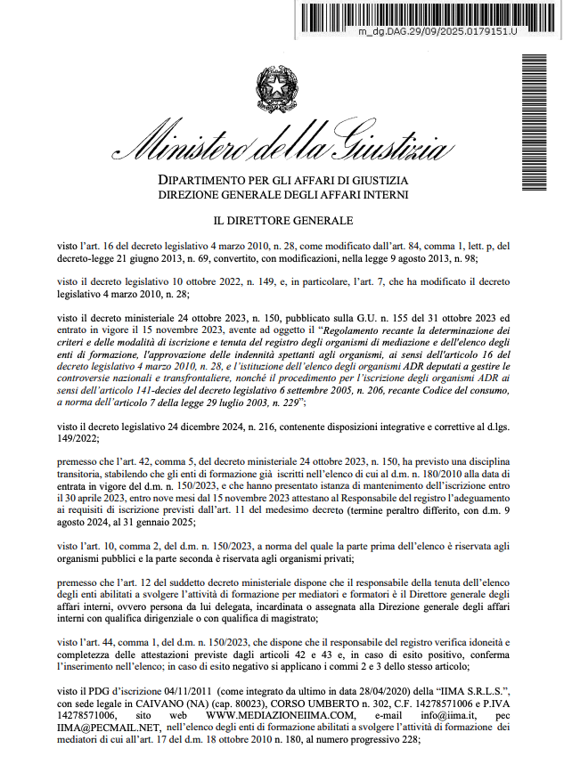 IIMA è iscritto al n. 4 nella sezione speciale degli organismi ADR di cui all’art. 3, comma 1, del d.m. n. 150/2023, parte seconda – organismi privati